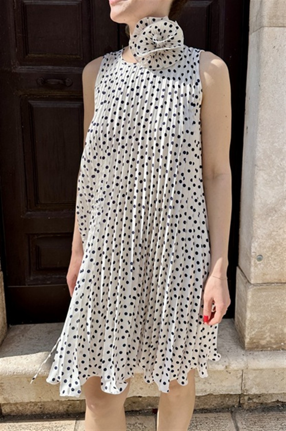 Abito corto plissé svasato a pois con fiore a cintura in tinta