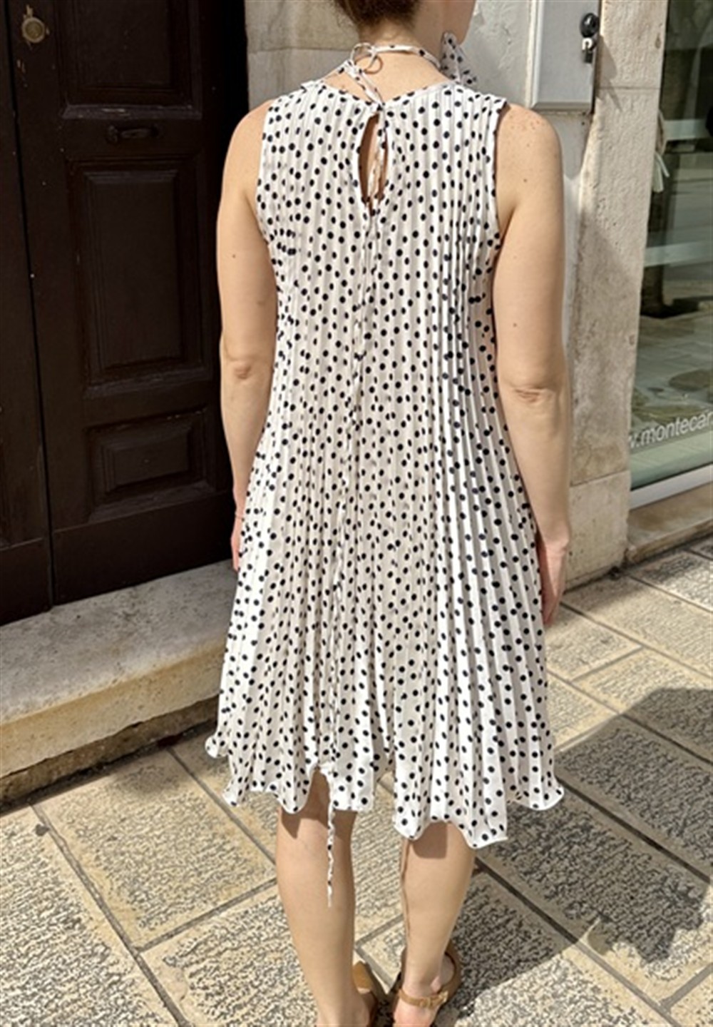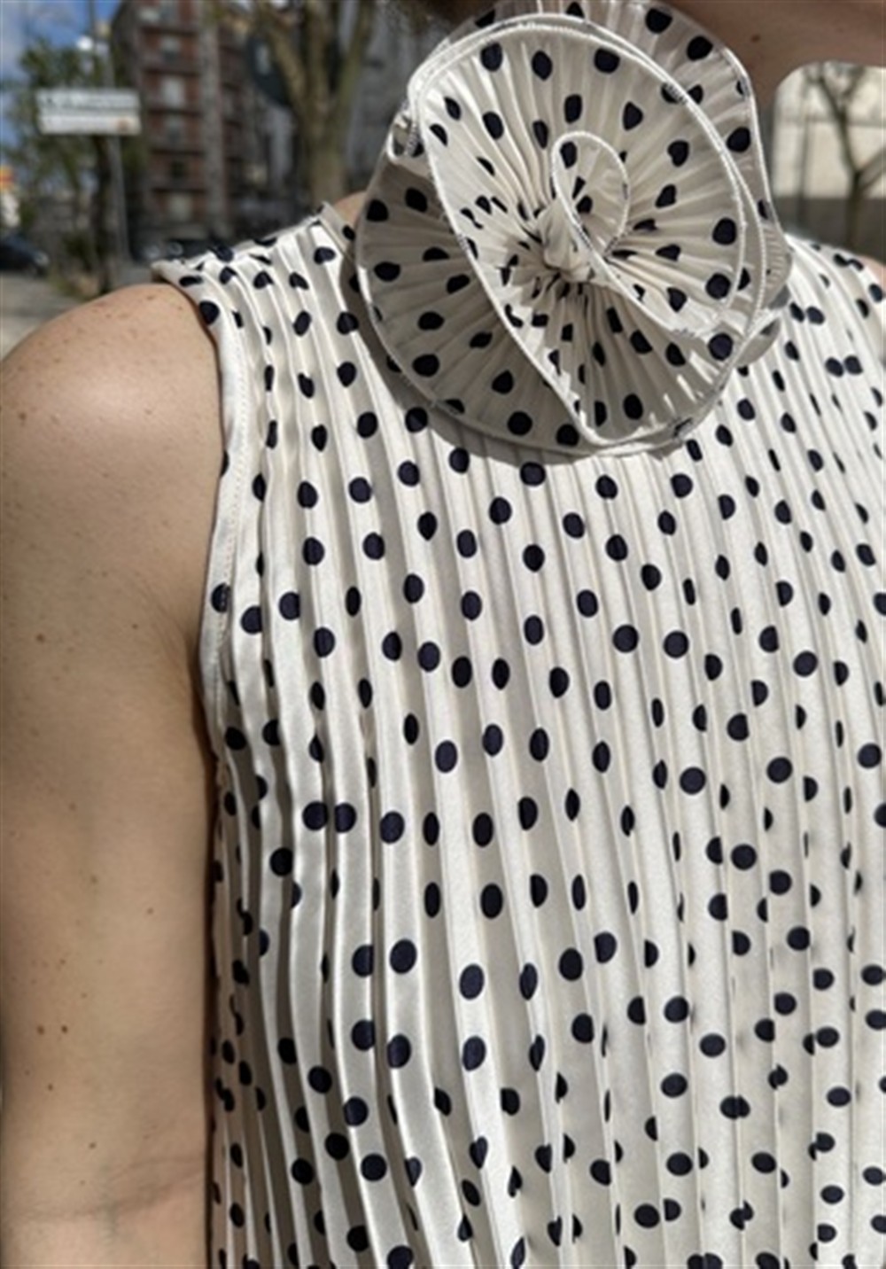 AMELIE Abito corto plisse svasato a pois con fiore a cintura in tinta