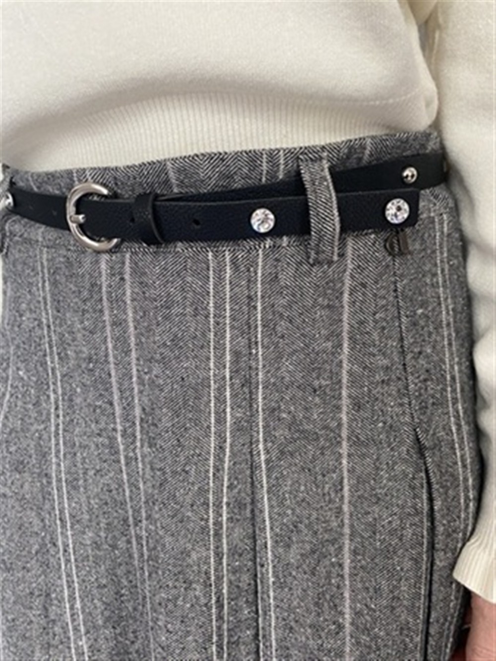 Minigonna a pieghe in tessuto spigato e cinta con strass