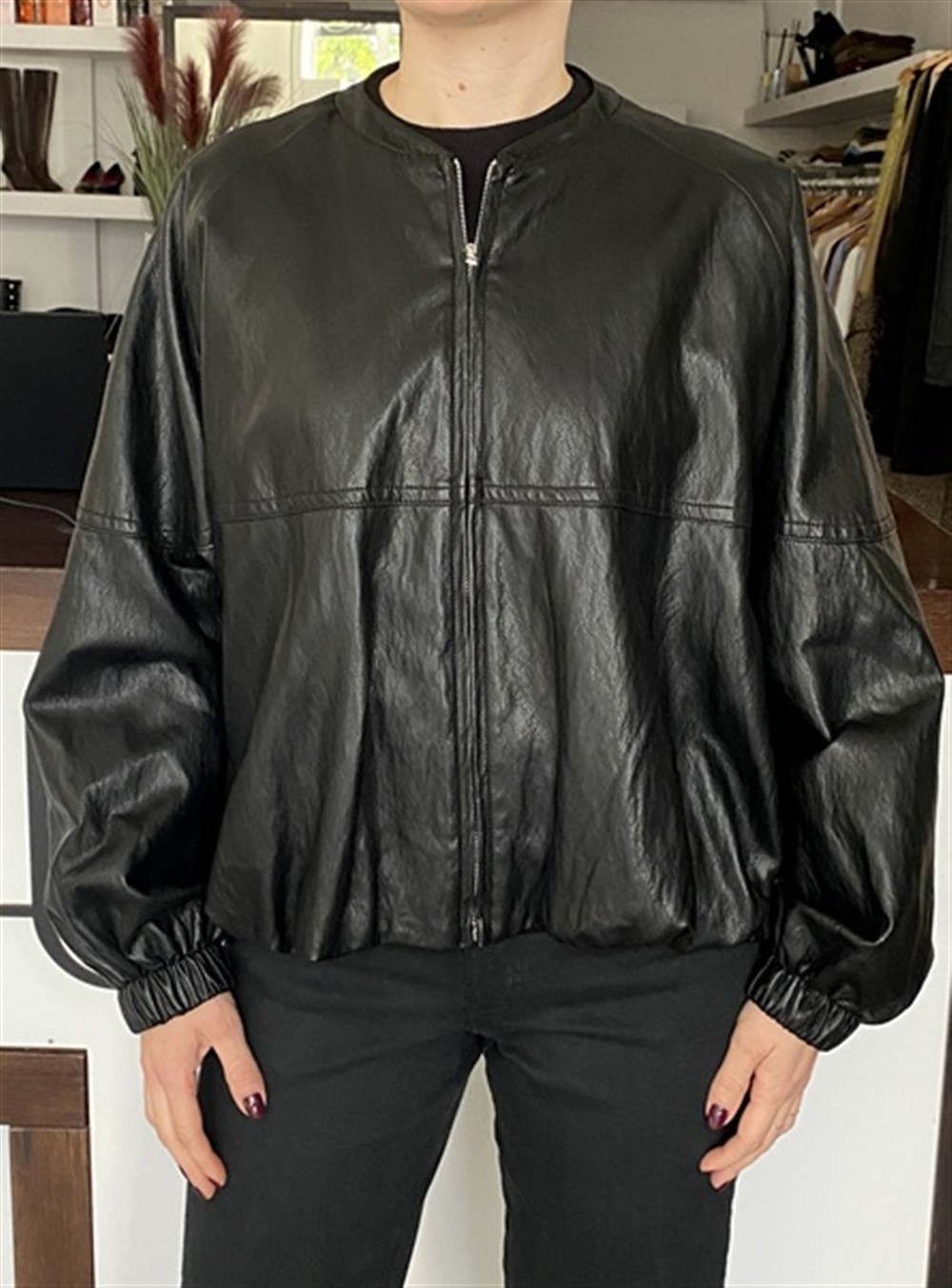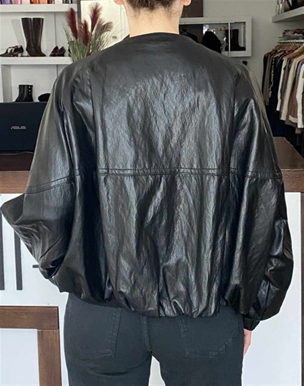 EFW250204 NERO Bomber in ecopelle con zip e arricciature al fondo