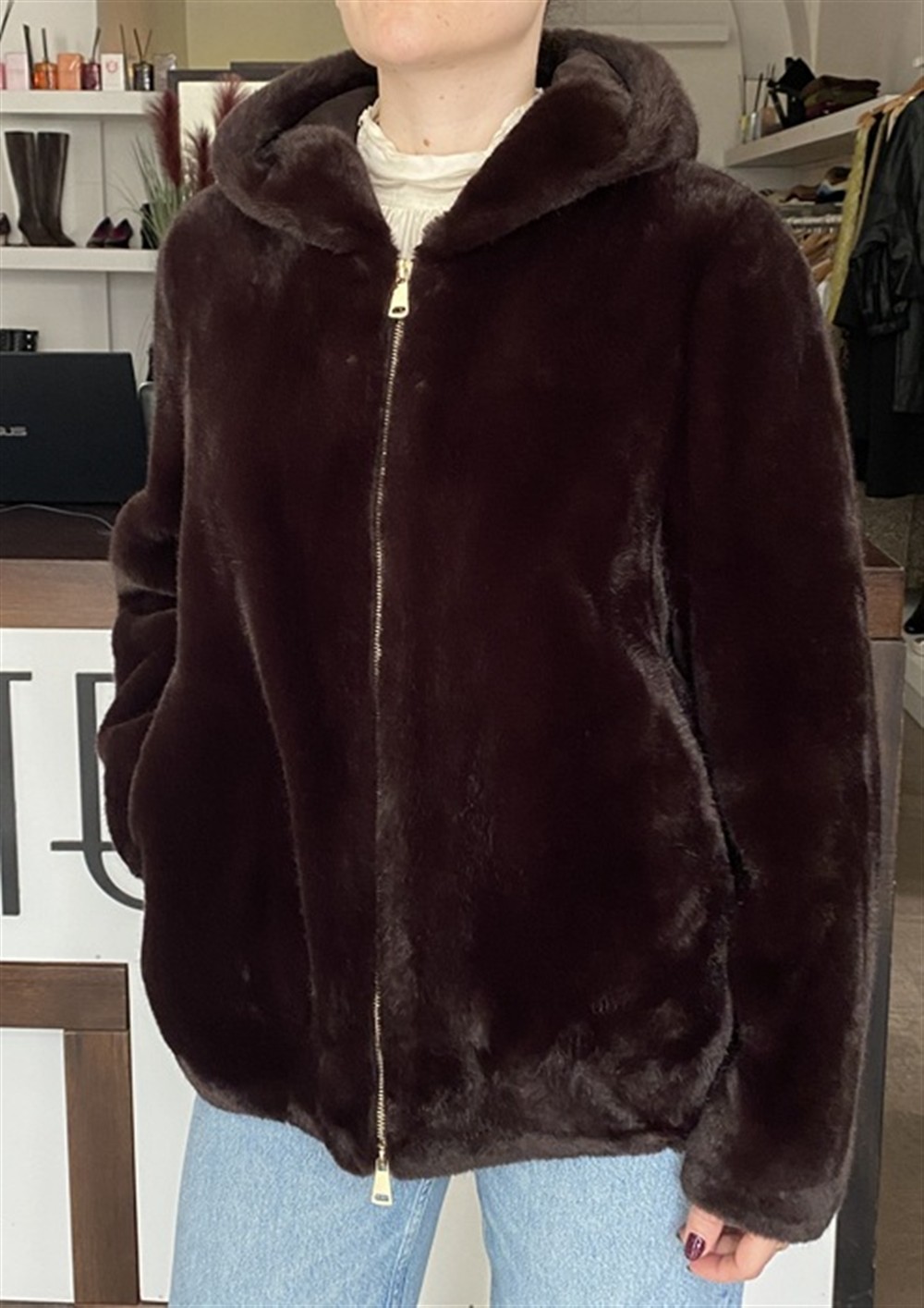 V330Y003A MORO Ecopelliccia con zip e cappuccio