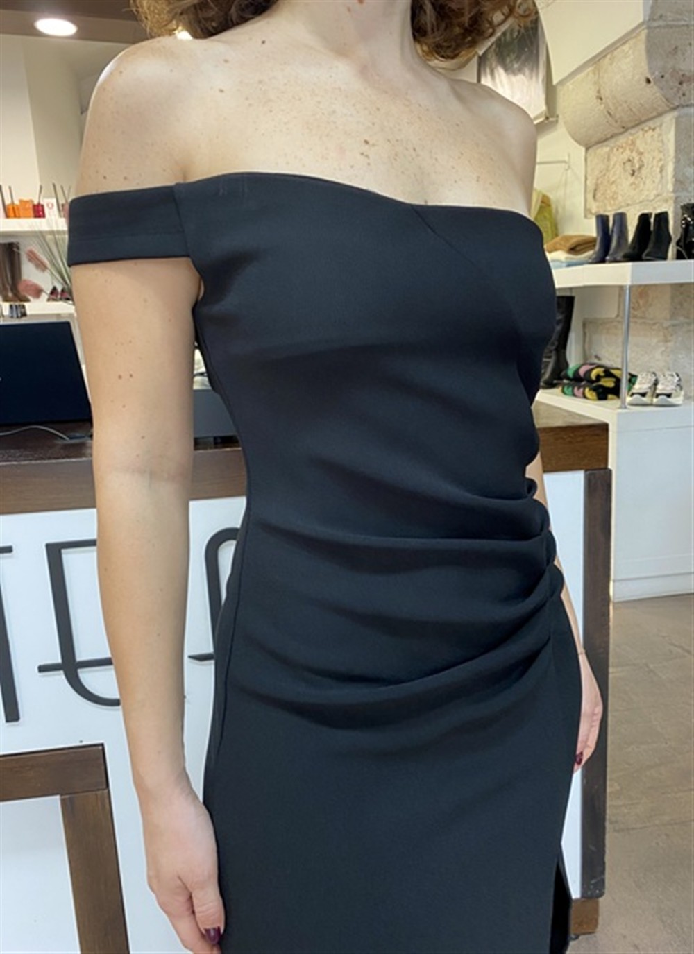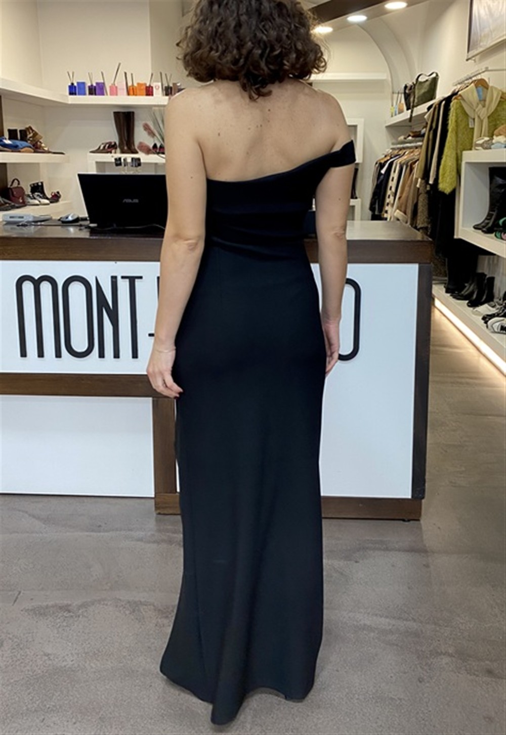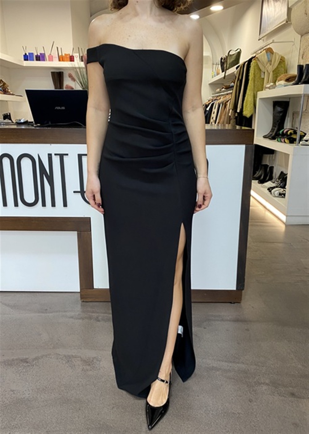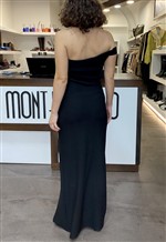Abito lungo monospalla con spacco e drappeggio laterale