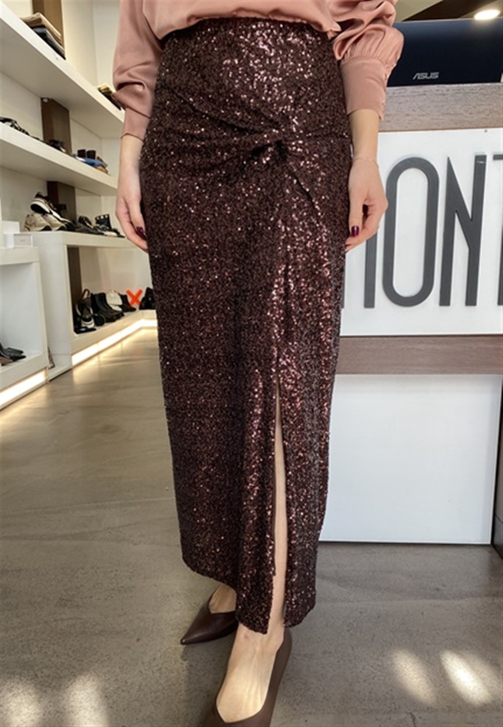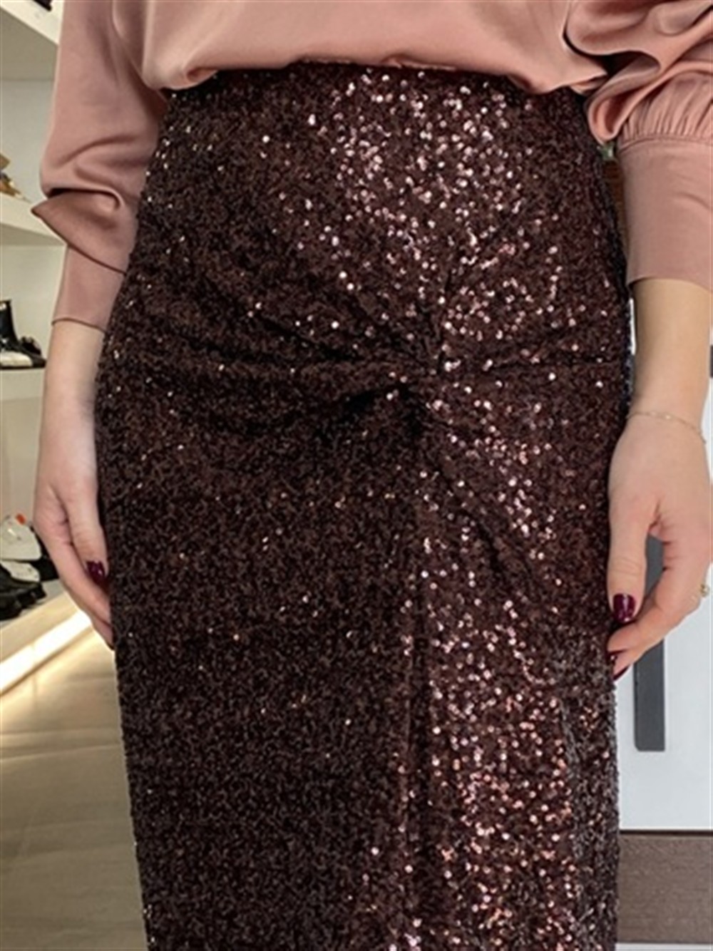 Gonna lunga in paillettes con drappeggio e spacco BURGUNDY