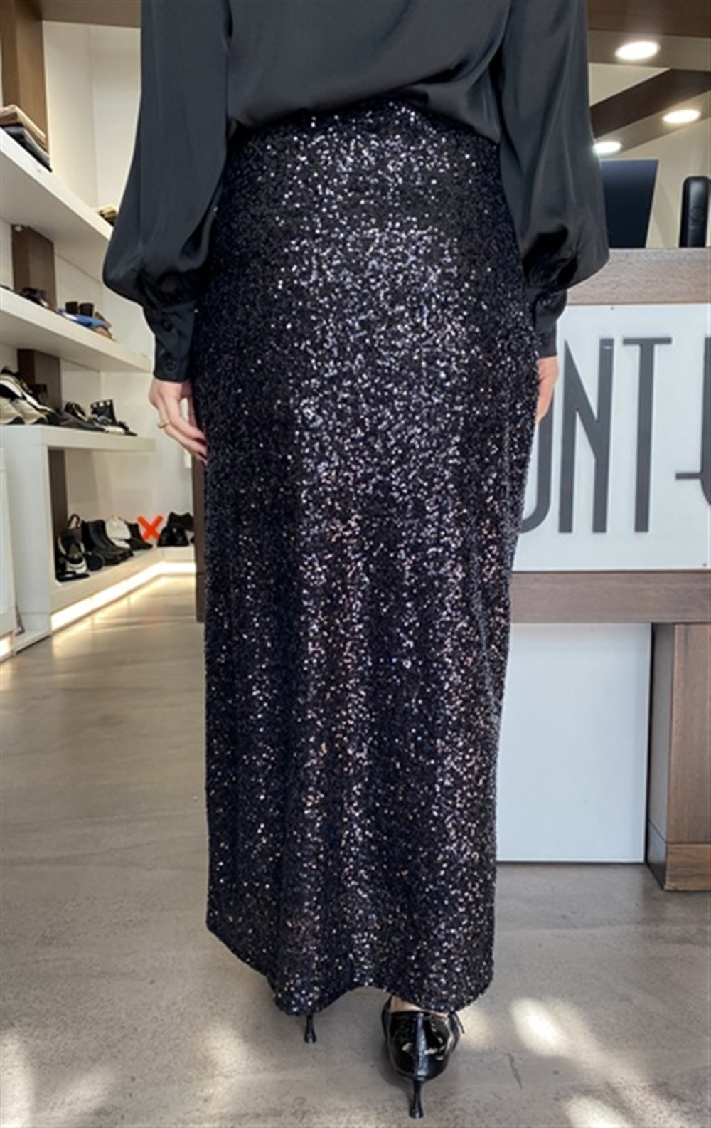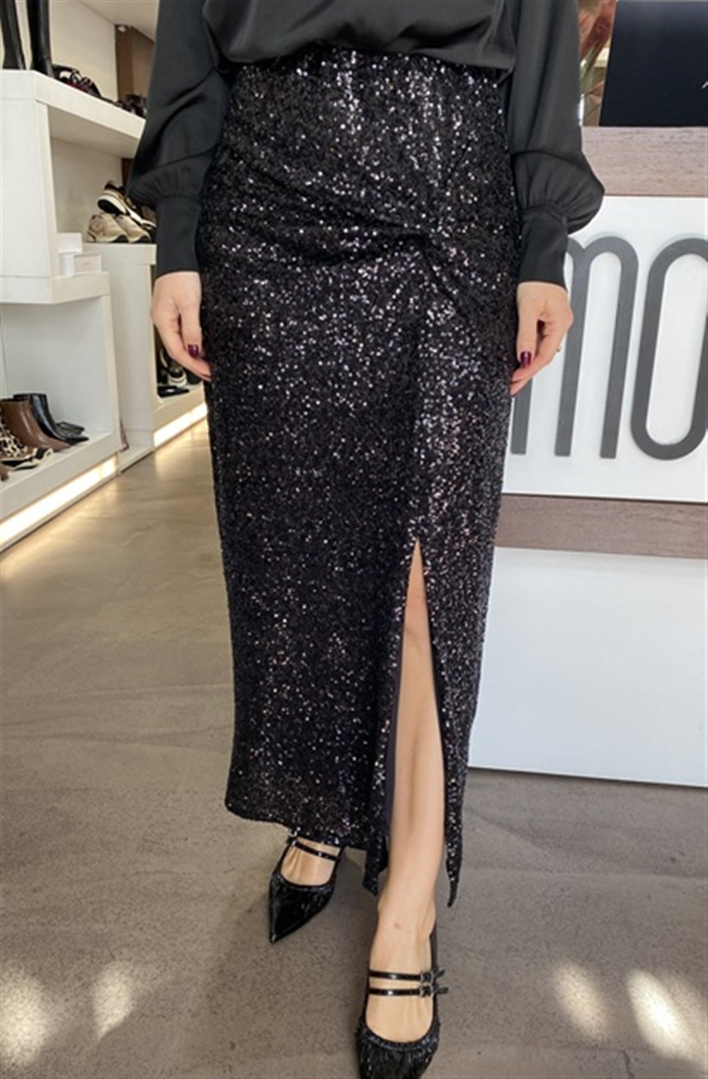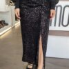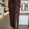 Gonna lunga in paillettes con drappeggio e spacco NERA
