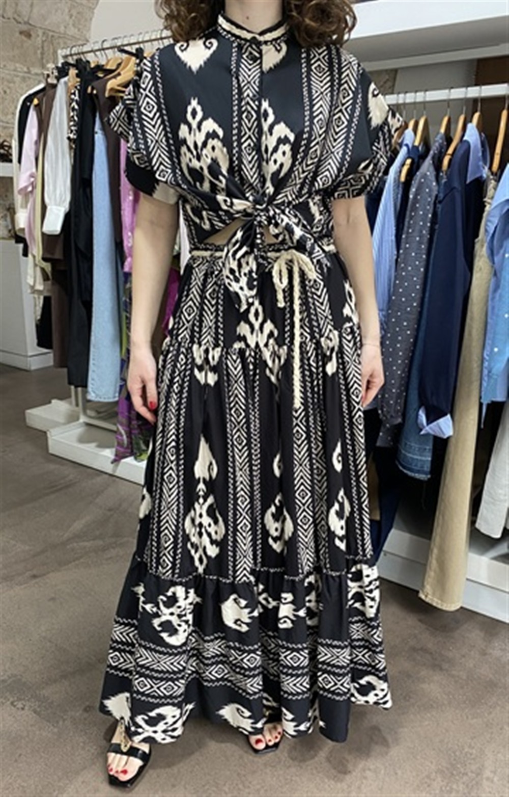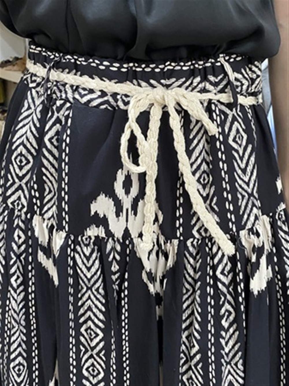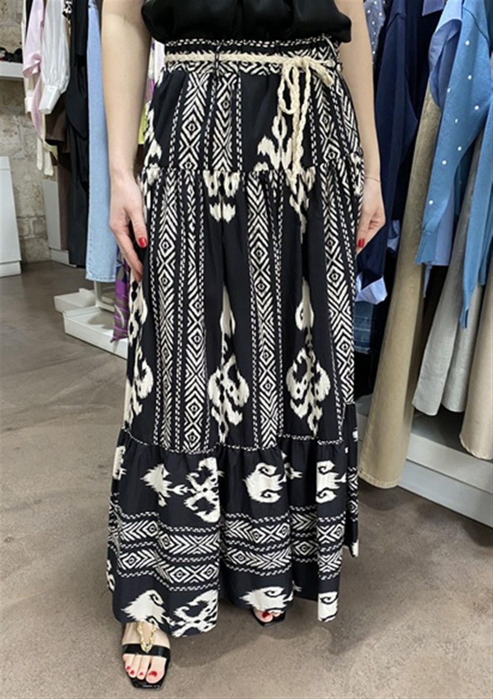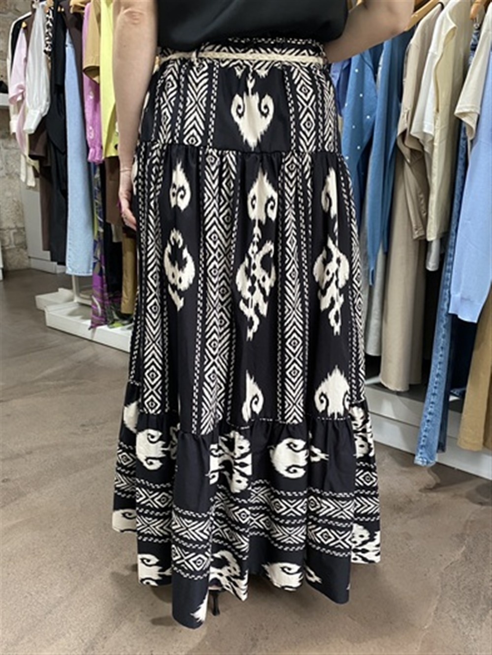GCHN1BLA Gonna lunga a balze stampa etnica con cintura