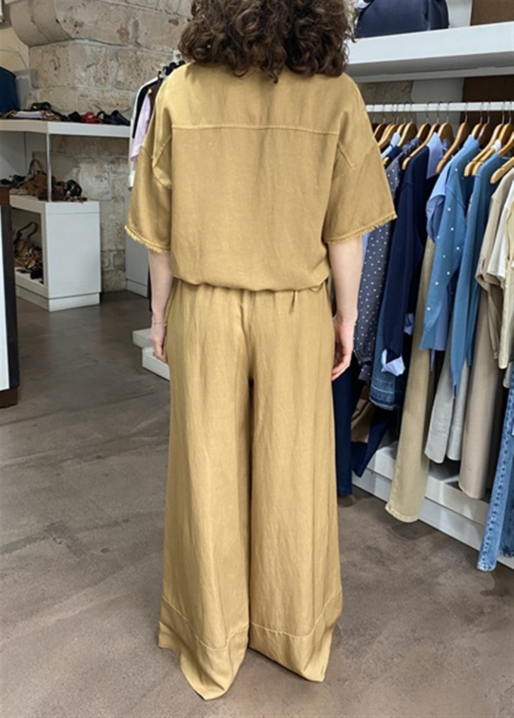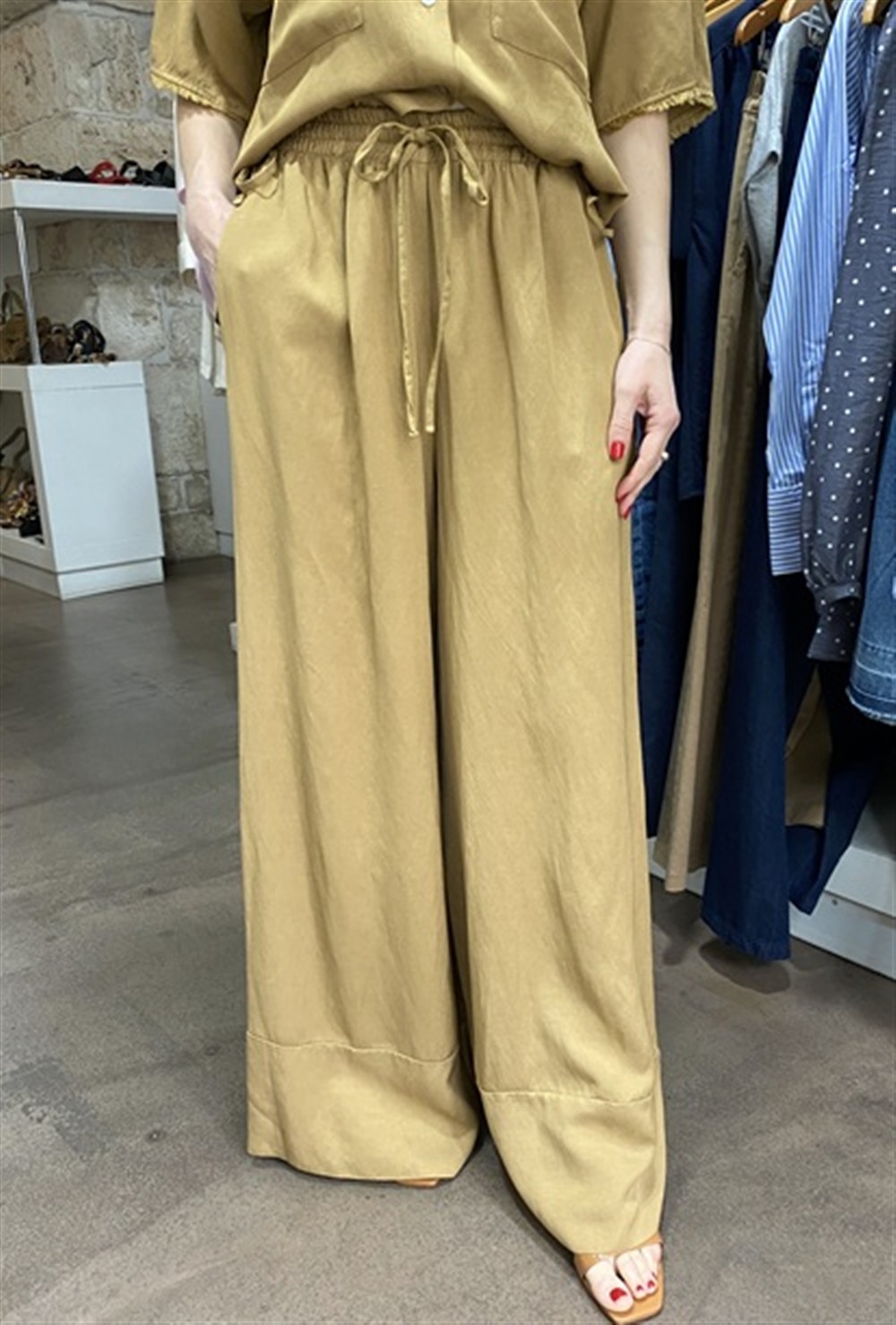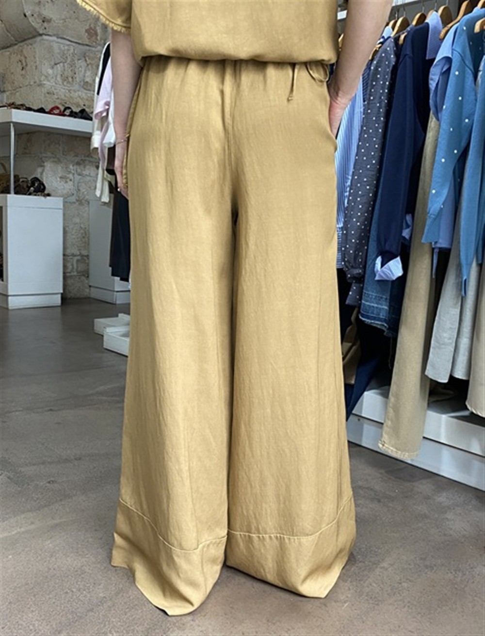 Pantalone con gamba larga ed elastico in vita sabbia