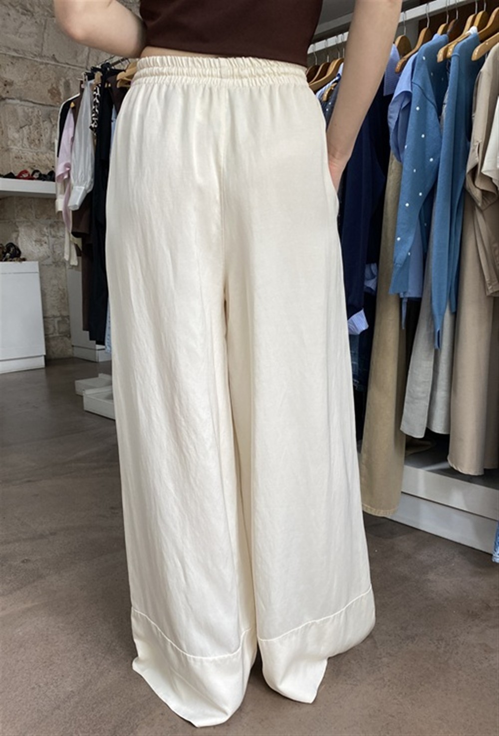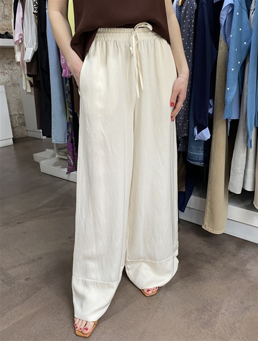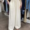 Pantalone con gamba larga ed elastico in vita burro