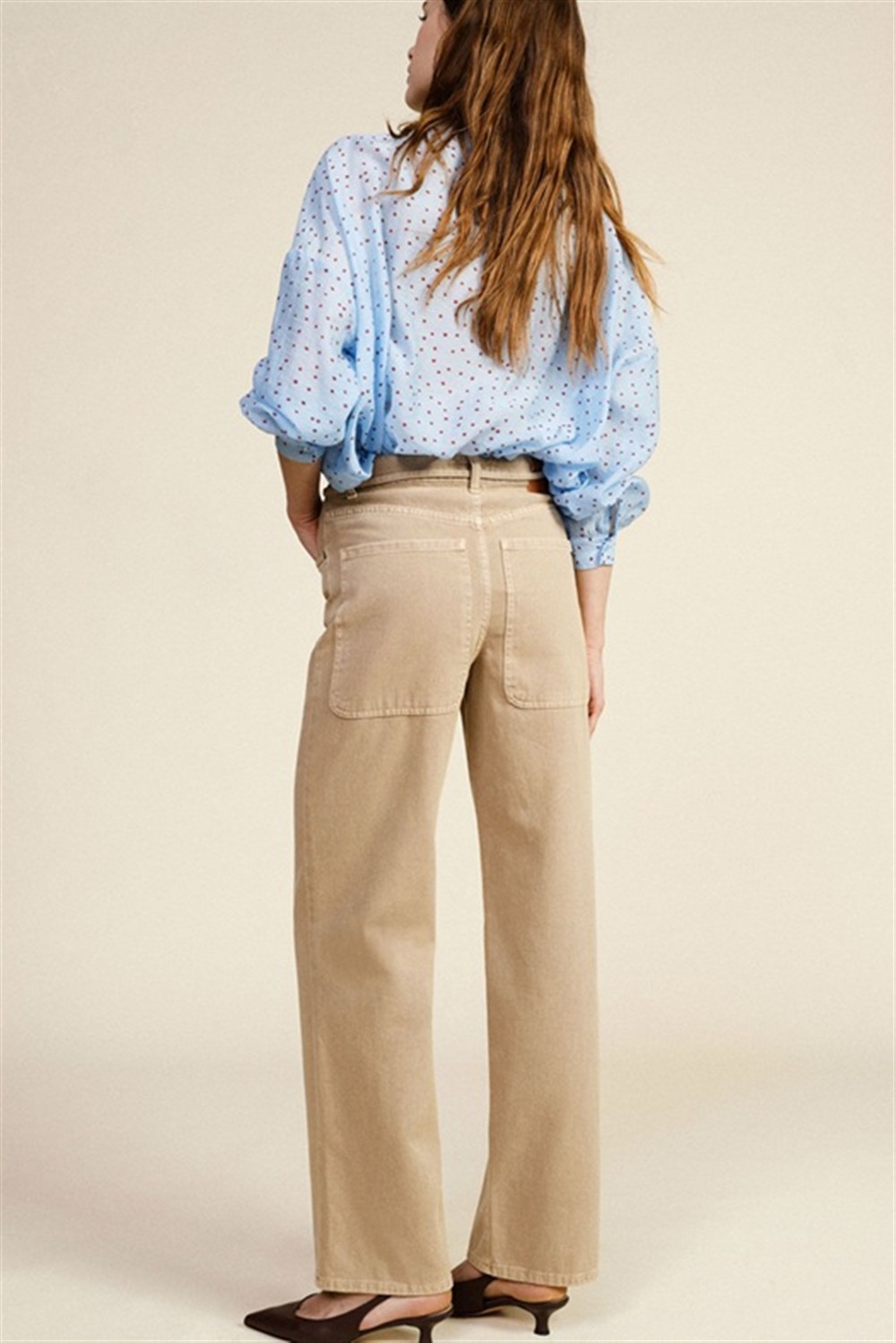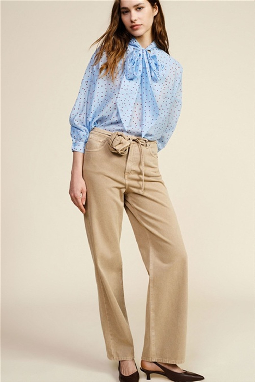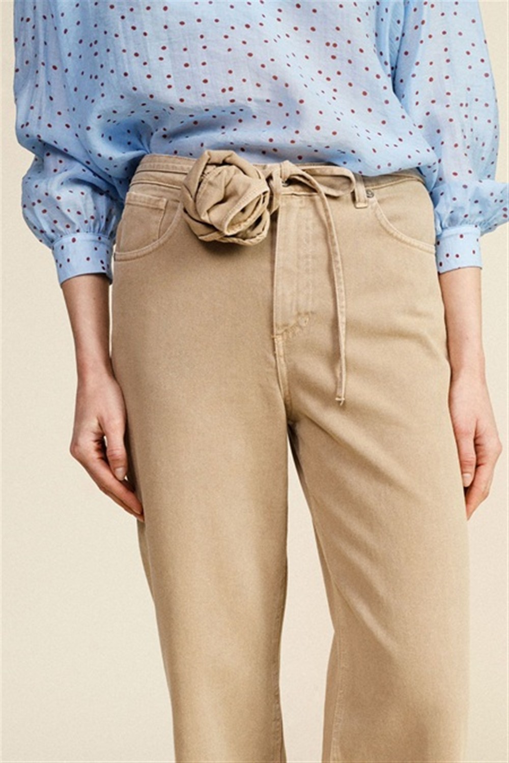 Pantalone in bull denim con gamba dritta e cintura a fiore