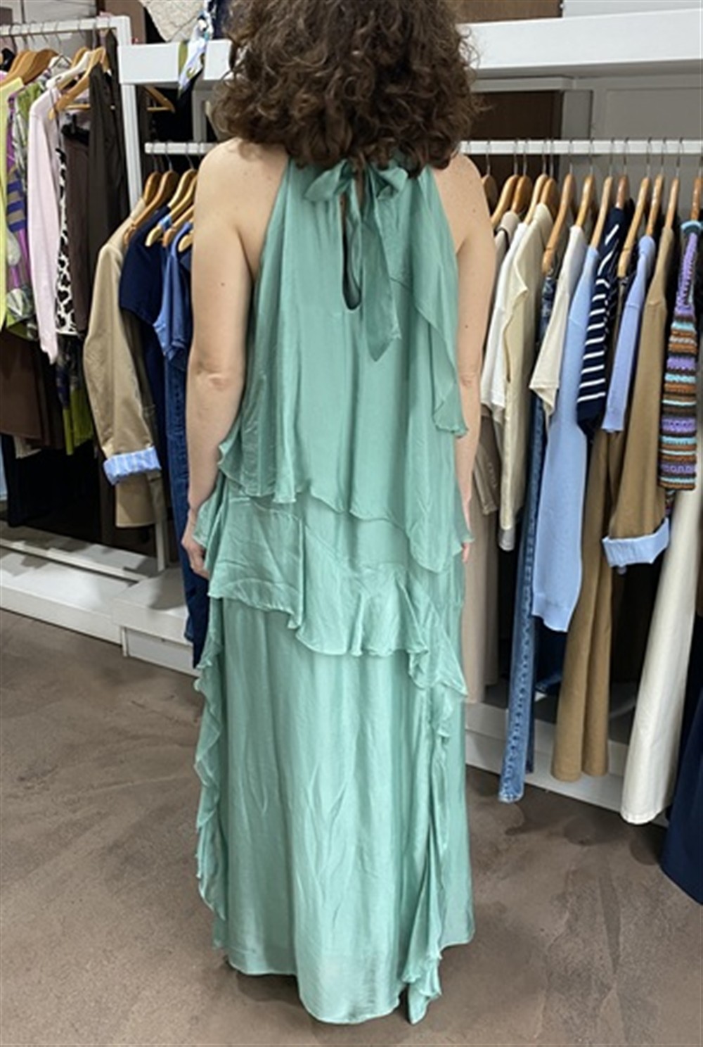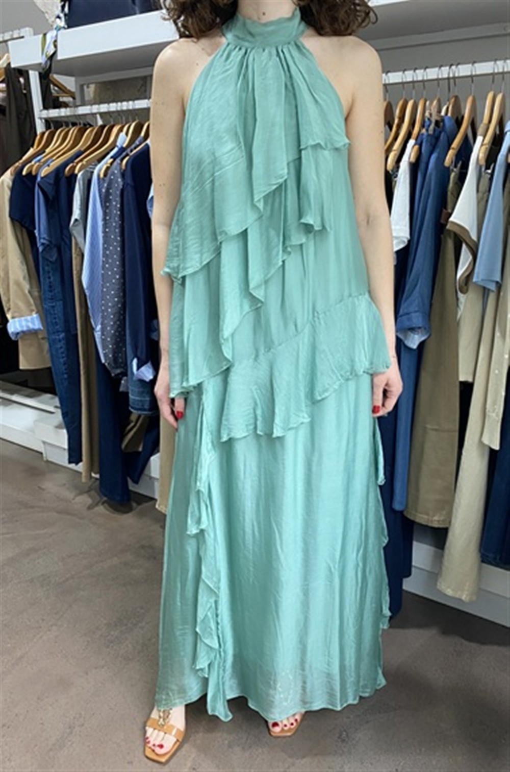 A207A017A Abito lungo con scollo allamericana e balze