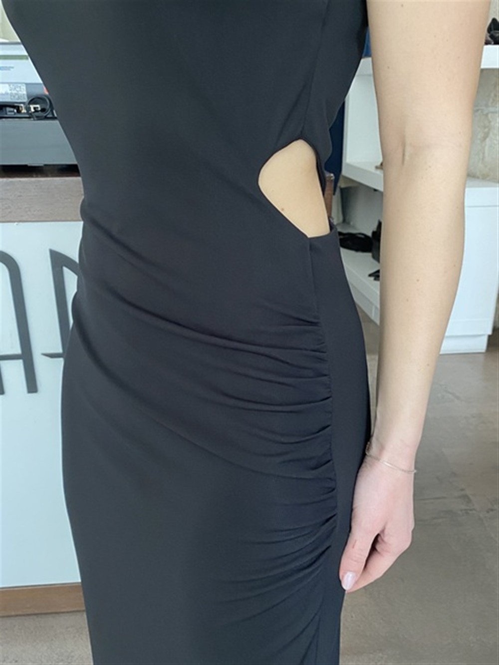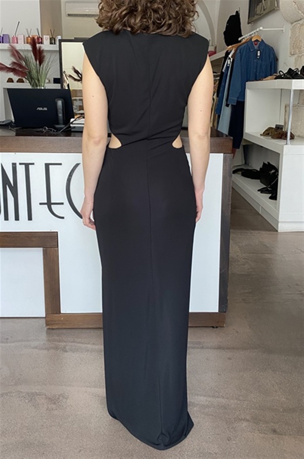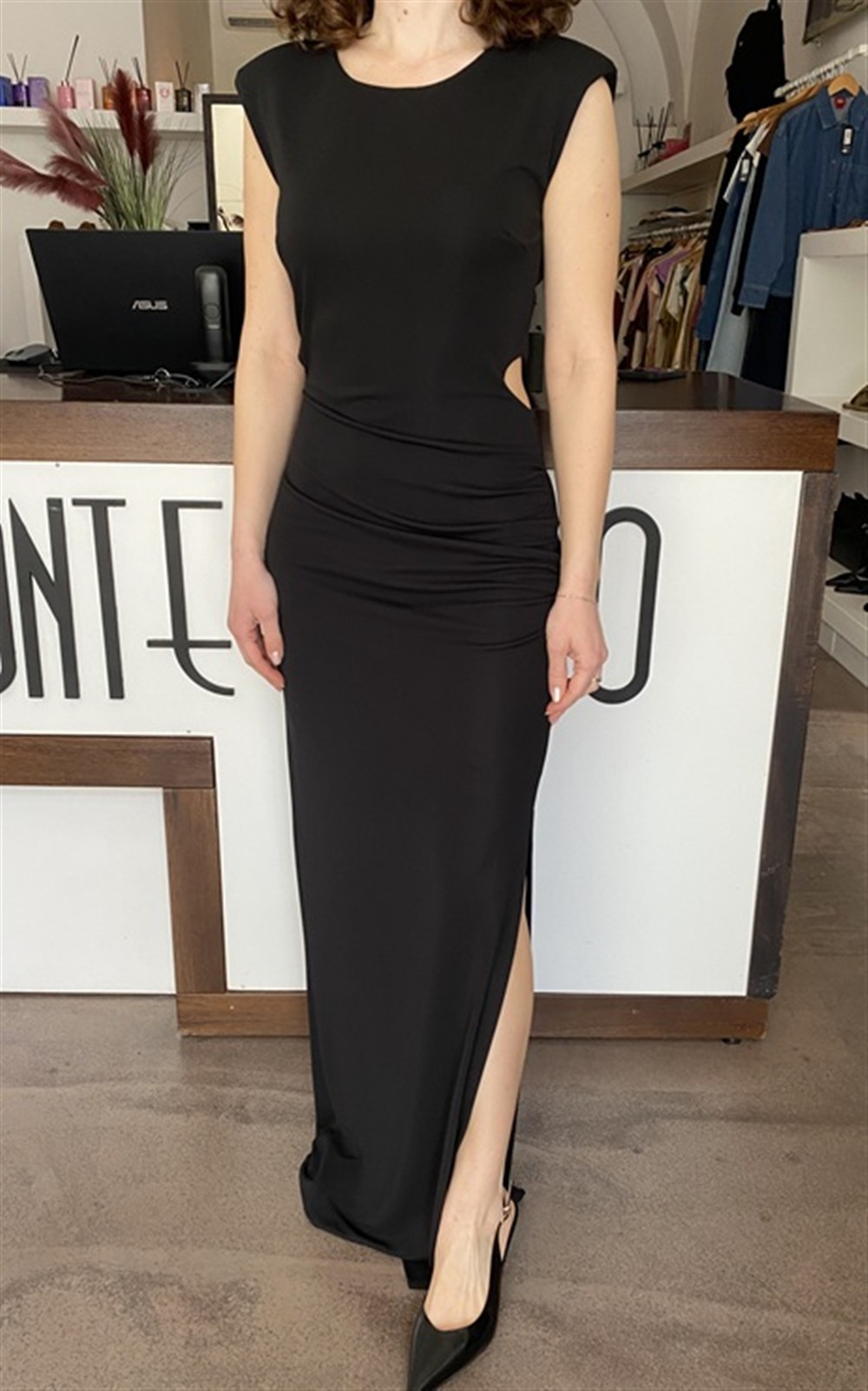 SSA4020 NERO Abito lungo smanicato cut out con drappeggio e spacco laterale