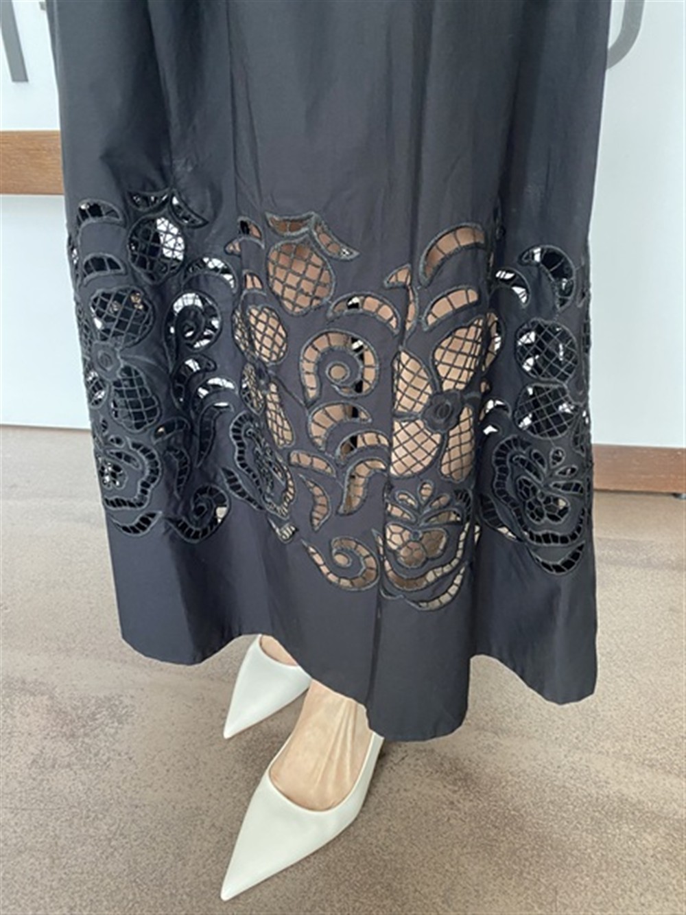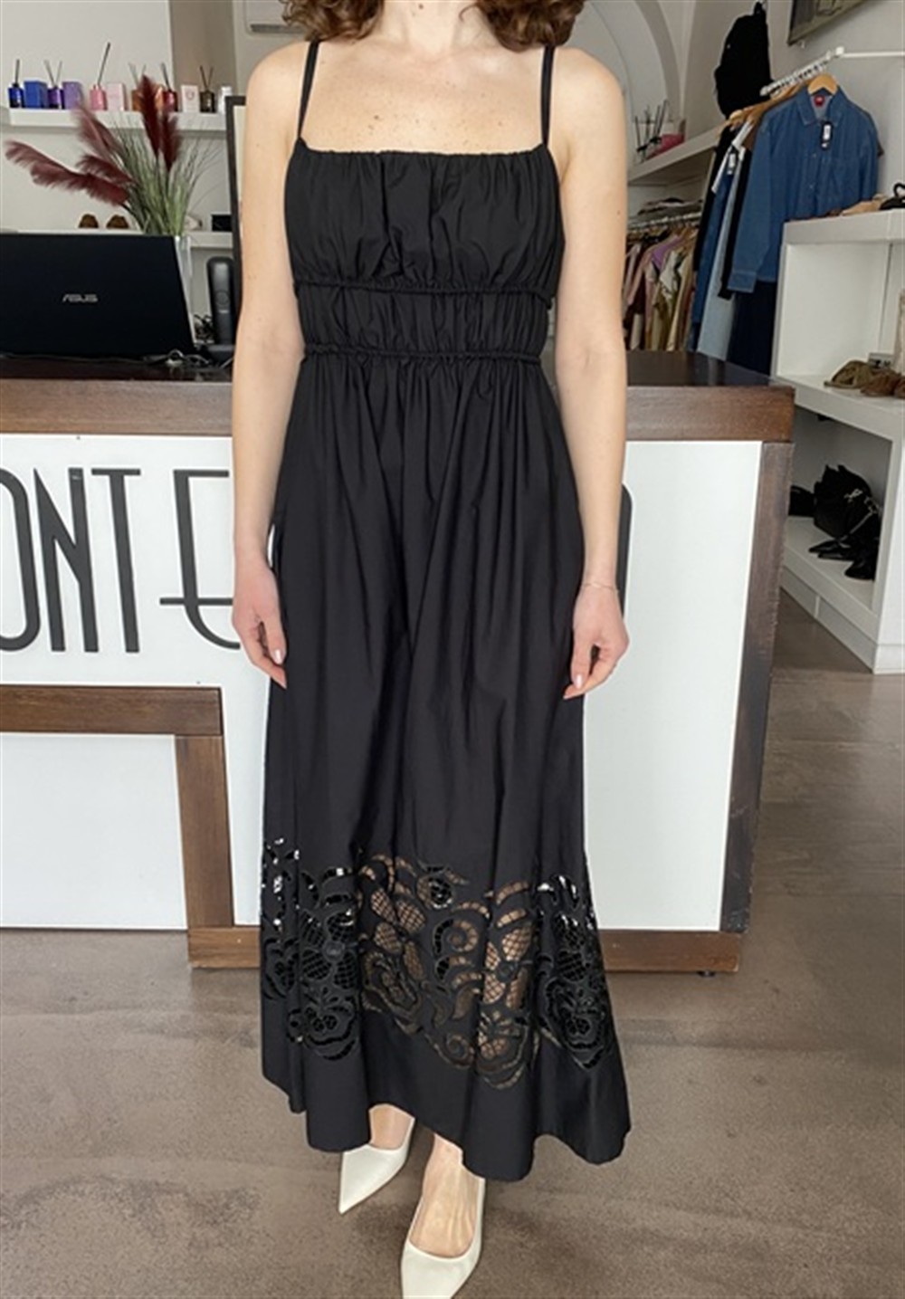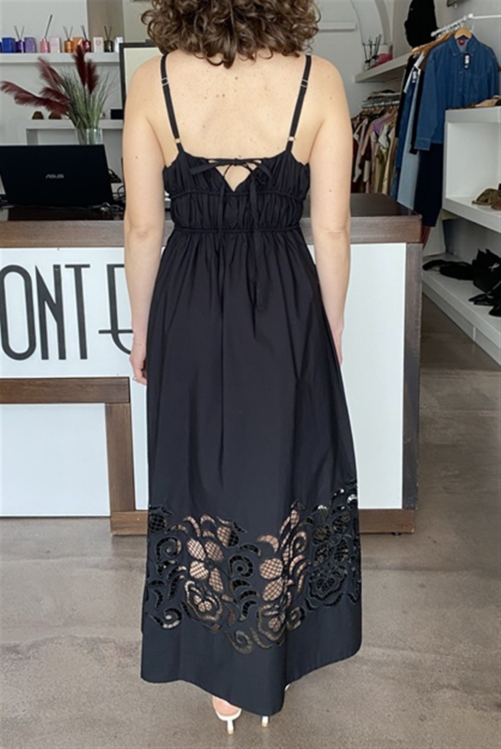 Abito lungo con bretelle sottili, corpino elasticizzato e ricamo ad intaglio sulla