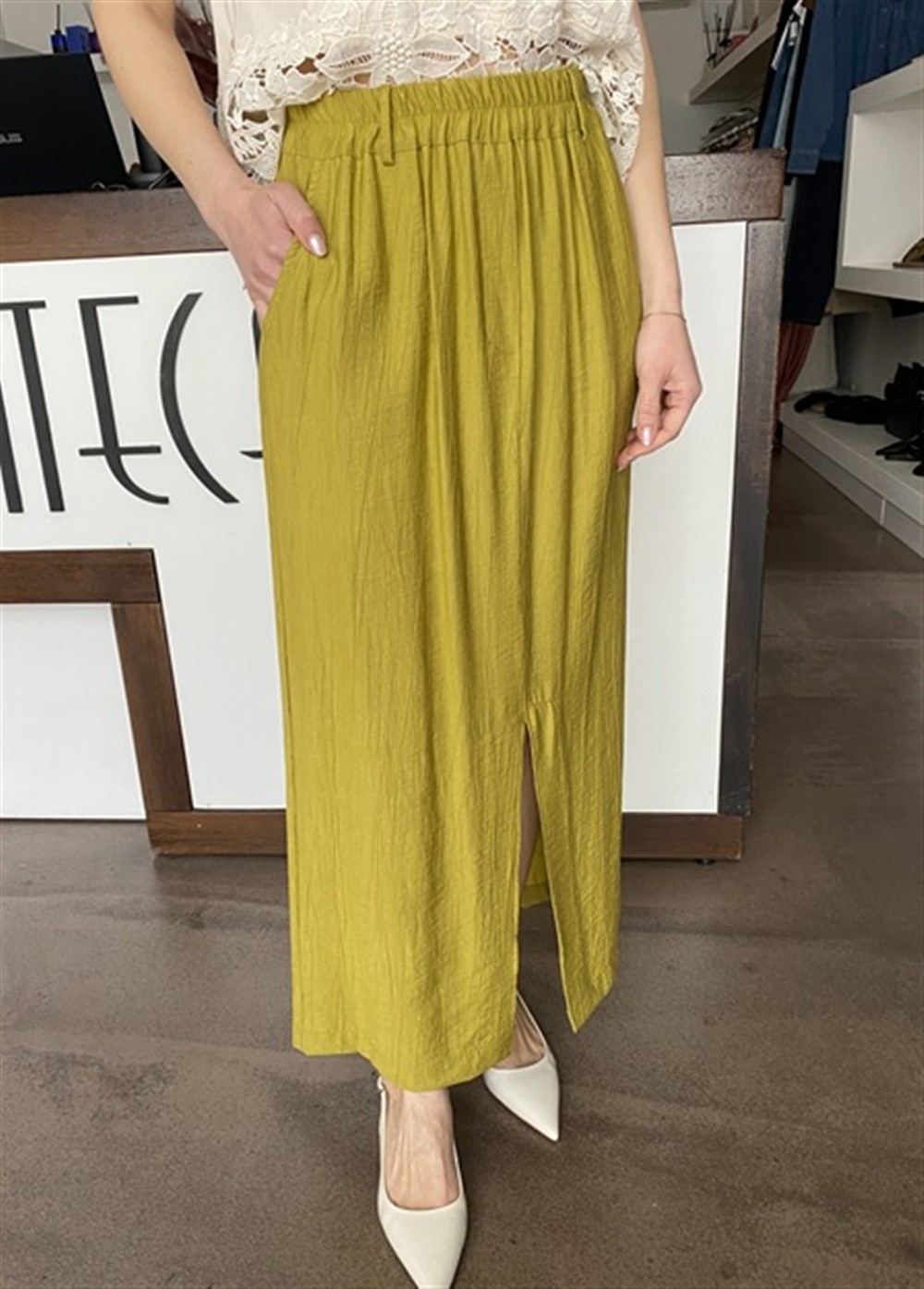 Gonna lunga con spacco frontale e posteriore al centro ed elastico in vita cedro