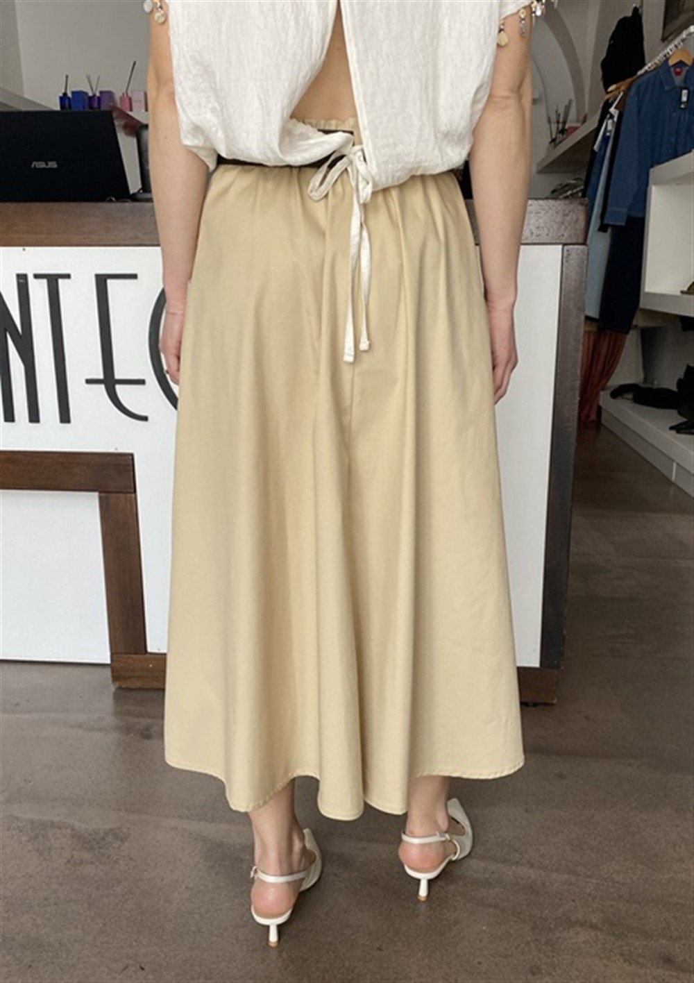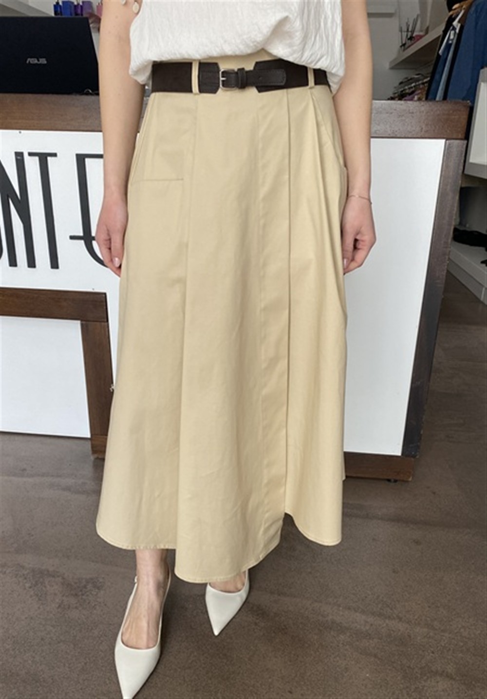 Gonna midi con tasche frontali, cintura ed elastico sul retro del cinto