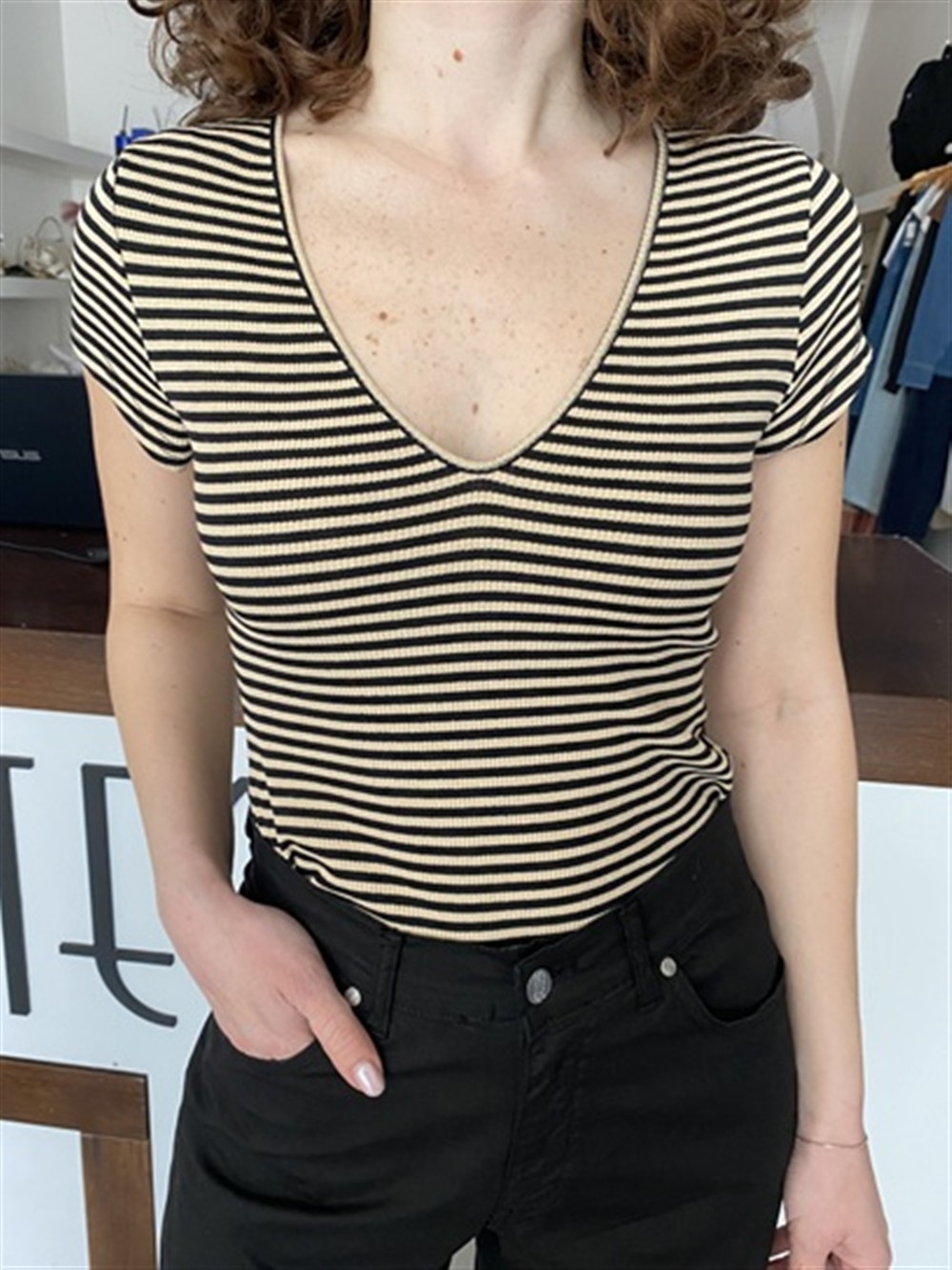 T-shirt a costine con scollo a v stampa righe