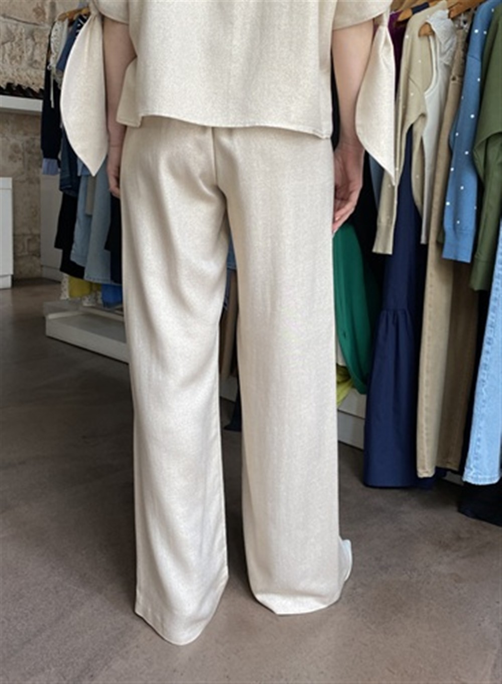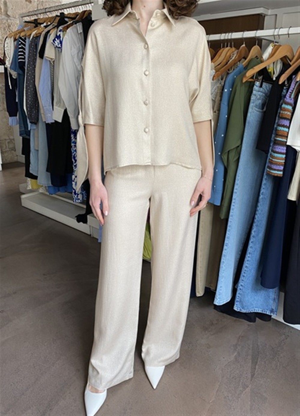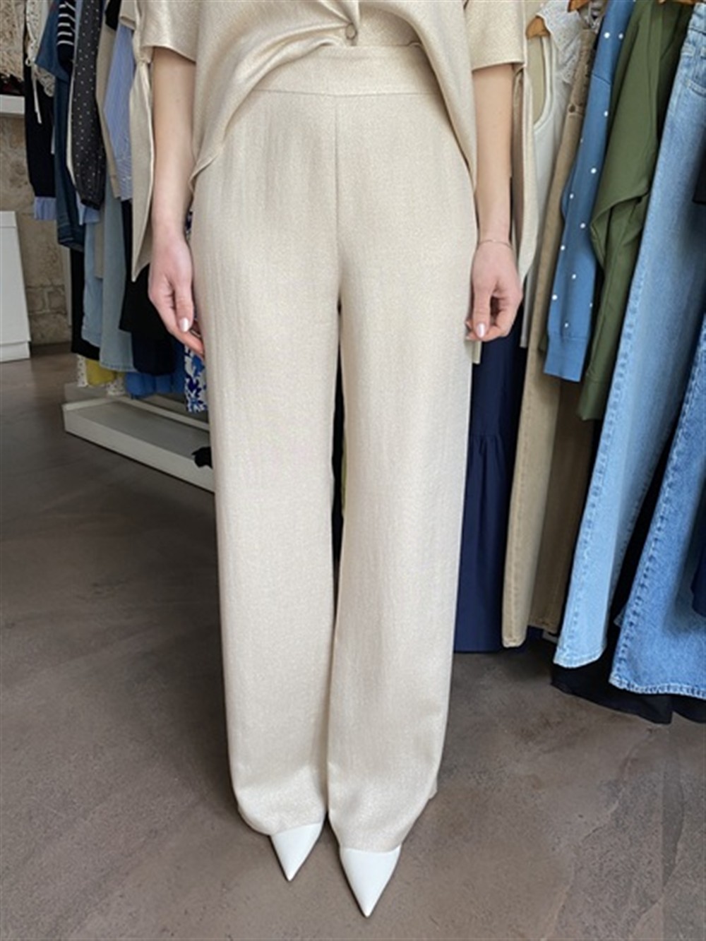 C0522 Pantalone gamba dritta in lurex con elastico sul retro del cinto