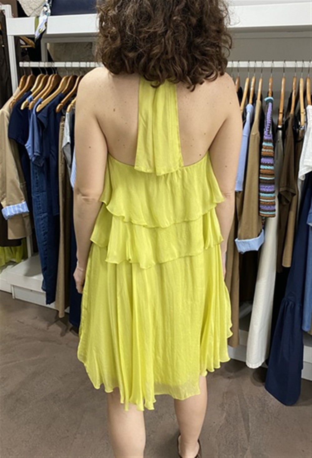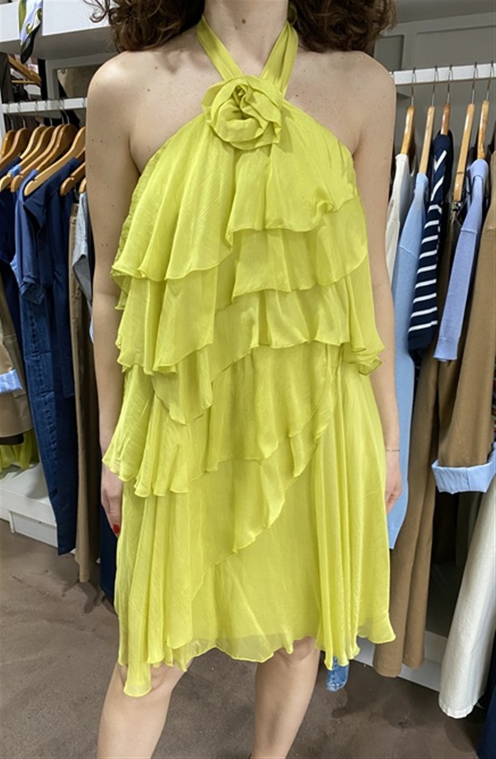 Abito corto con scollo all’americana a balze lime