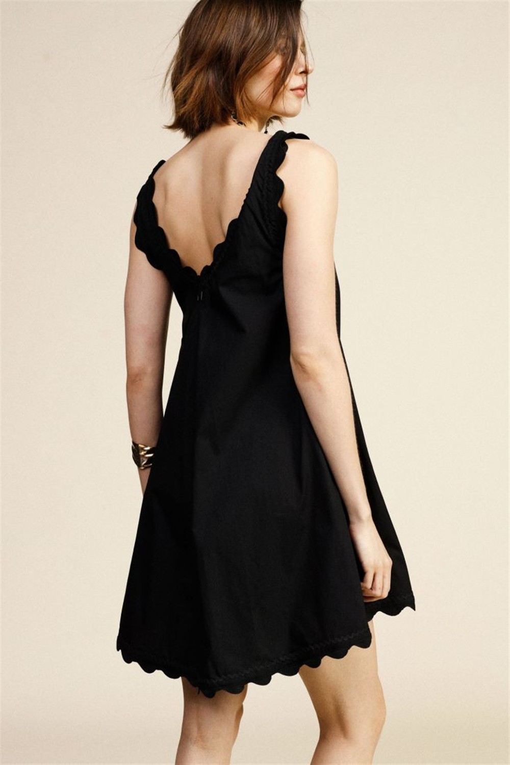 ALV1RAAA Abito corto scampanato con ricamo lungo lo scollo le bretelle e sul fondo