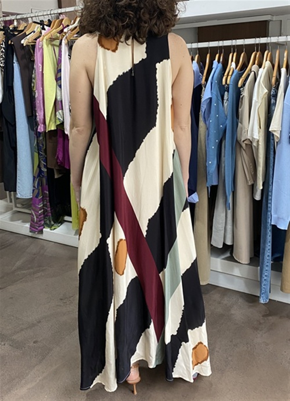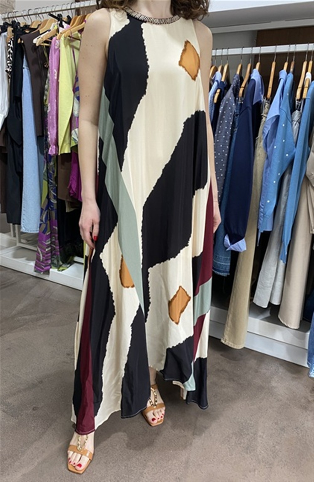 Abito lungo a fantasia scampanato con passamaneria lungo lo scollo